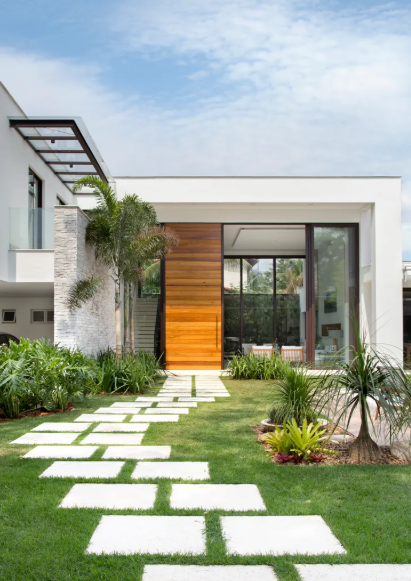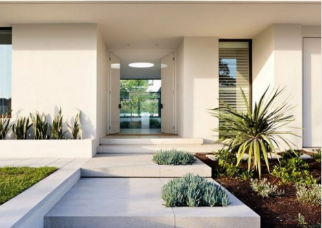 This beautiful entryway, crafted by our skilled team, features large rectangular white stones that create a clean and inviting pathway. Each stone is bordered by lush green grass, with neat grassy separations between every step that add a natural, seamless flow to the design. Surrounding the detailed layout, small built-in planters bring additional greenery and life, enhancing the fresh and elegant look. This harmonious blend of white stone and vibrant grass perfectly showcases the precision and care our team brings to every project.
