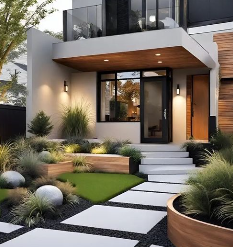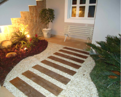 This elegant entryway, crafted by our team, features rectangular wood-toned stones that create a warm and natural path. Each large stone is surrounded by clean white pebbles, with small decorative stones placed between every step to create perfect spacing and visual balance. Around the detailed layout, small built-in planters add a touch of greenery, bringing life and charm to the design. The combination of textures, colors, and precise placement reflects the care, professionalism, and creativity our team brings to every project.